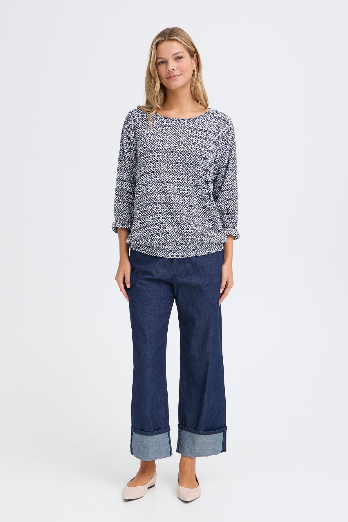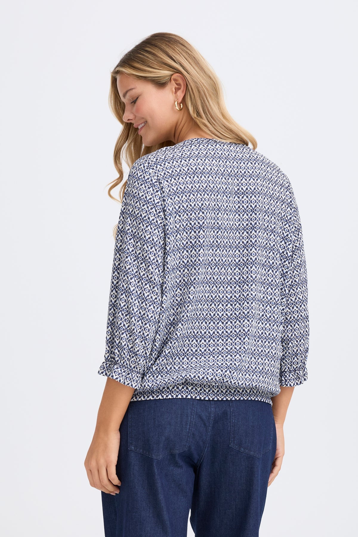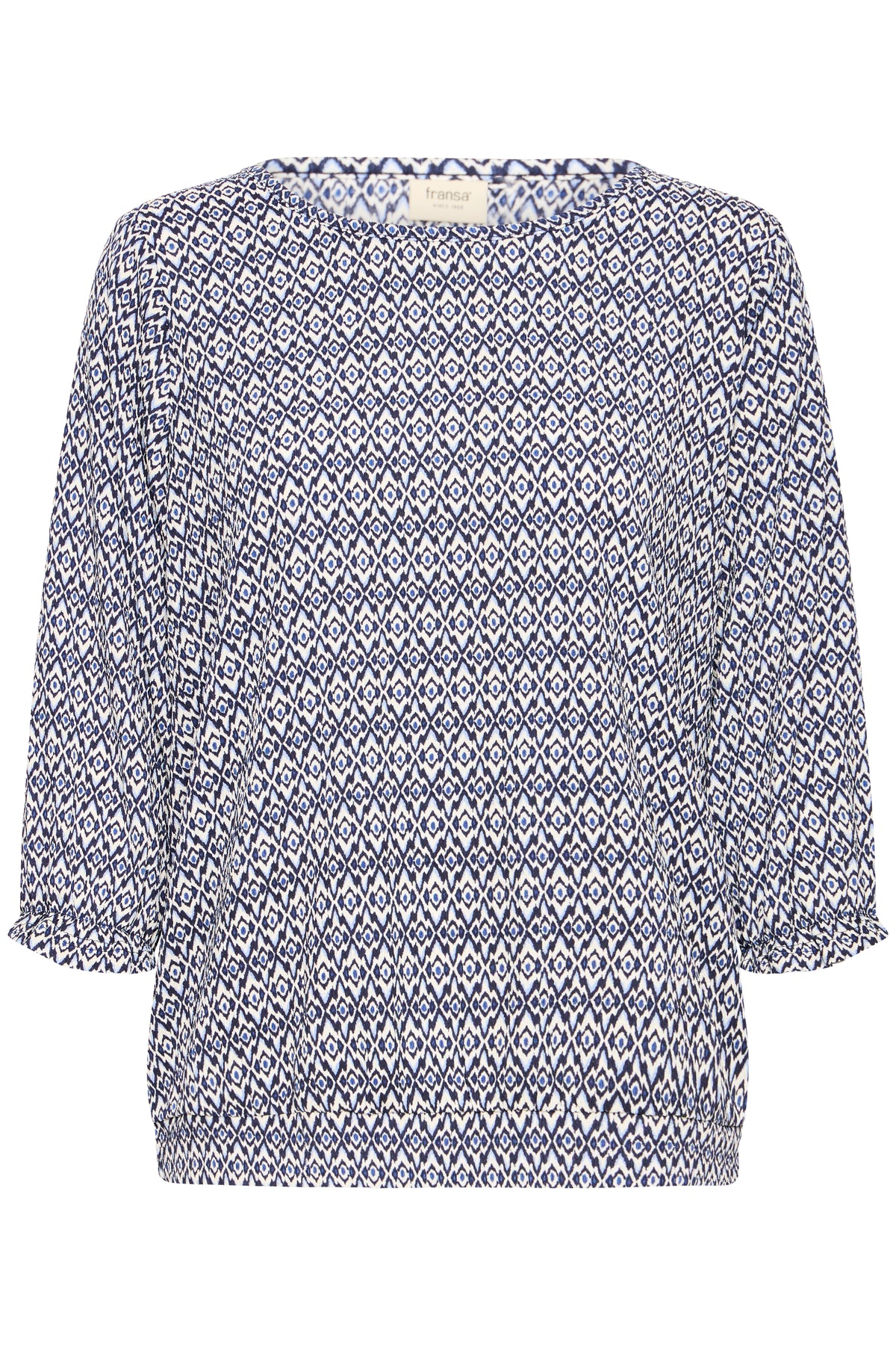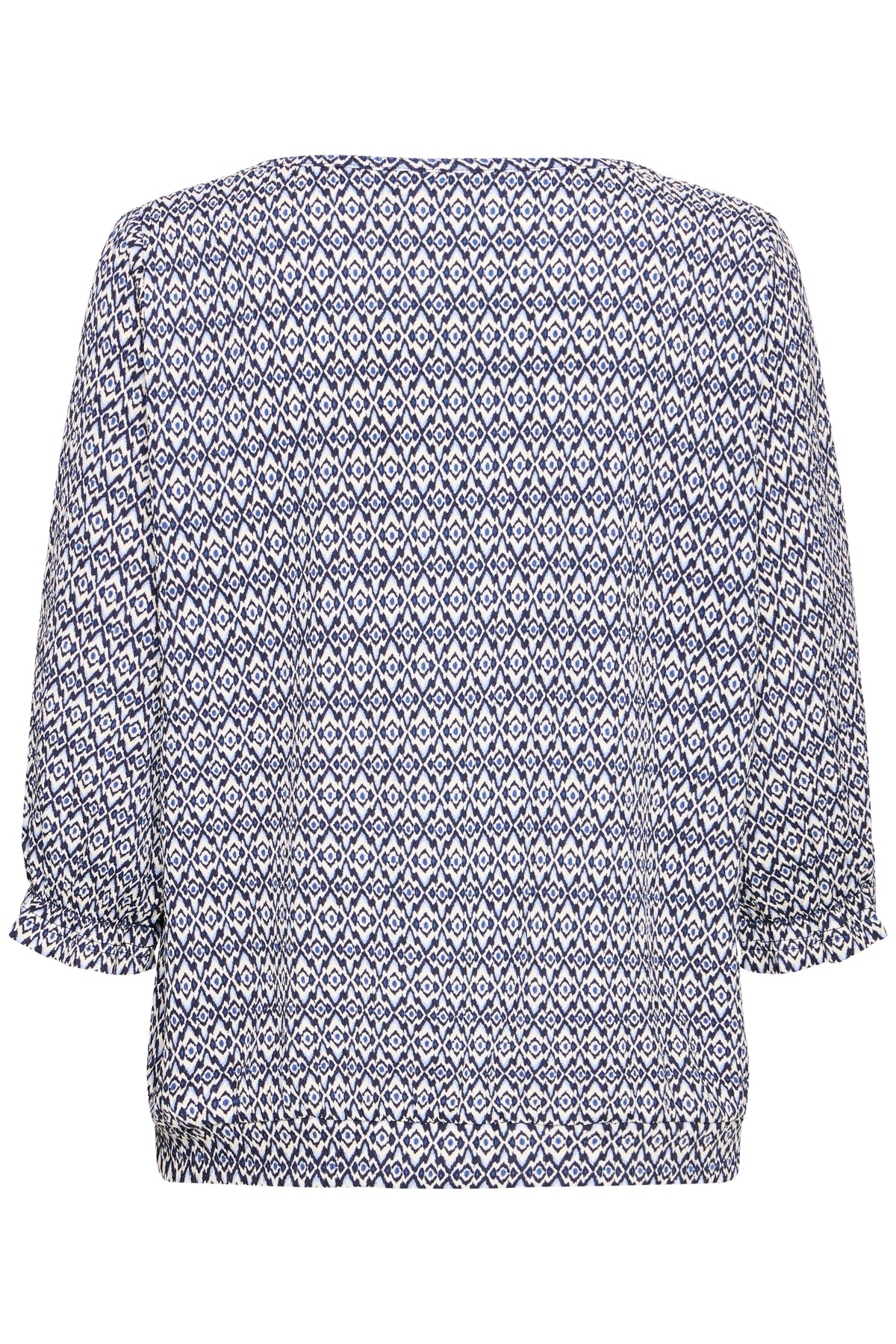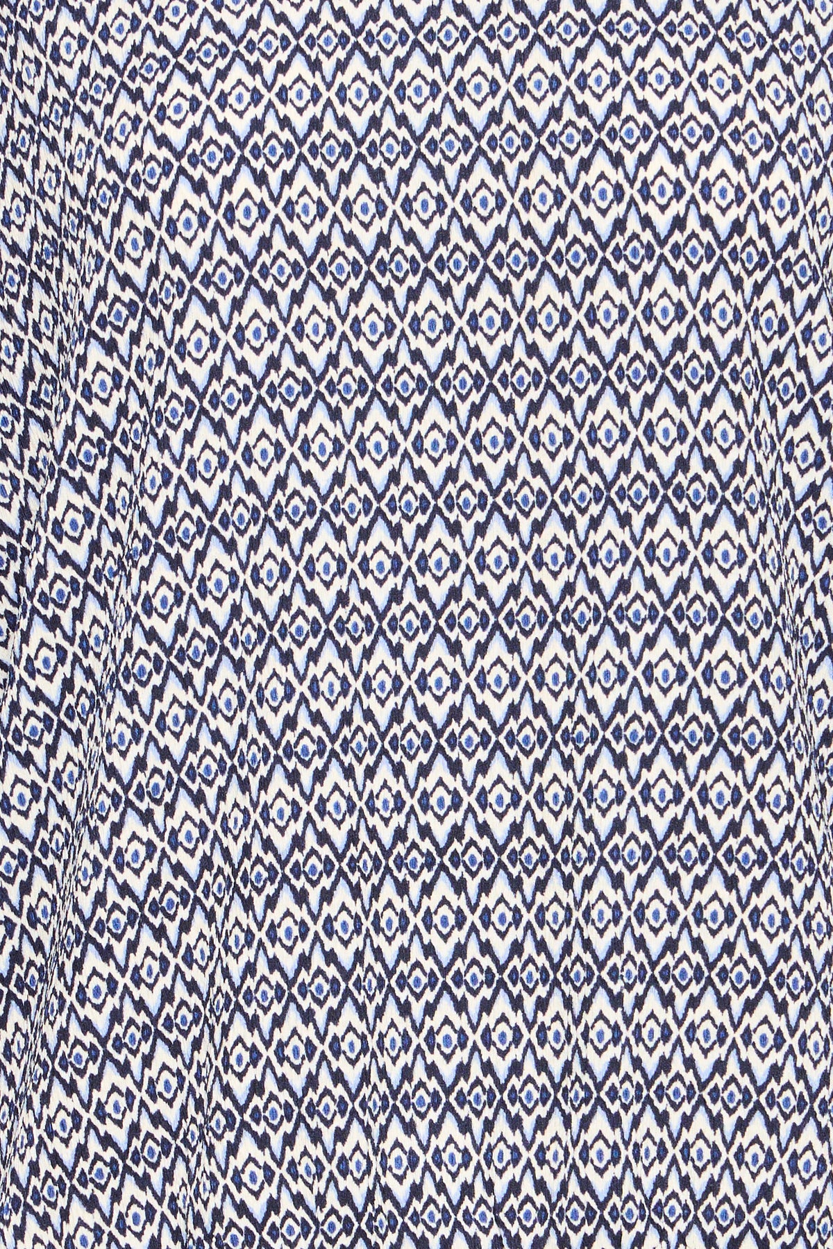pattern : All-over geometric micro-print in navy and white, creating a visually textured look