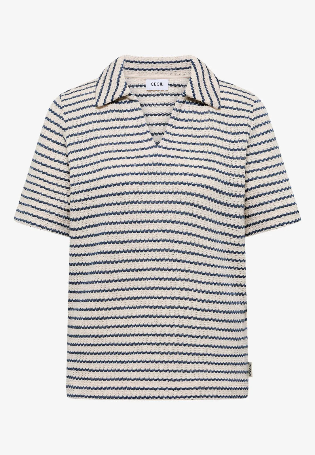 This women's polo shirt from CECIL brings a touch of summery lightness to your everyday life with its fine openwork knit and striped pattern. The polo collar and short sleeves give the shirt a sporty feel. Versatile and easy to combine, it goes perfectly with jeans, shorts, or a skirt – ideal for a casual yet stylish look.