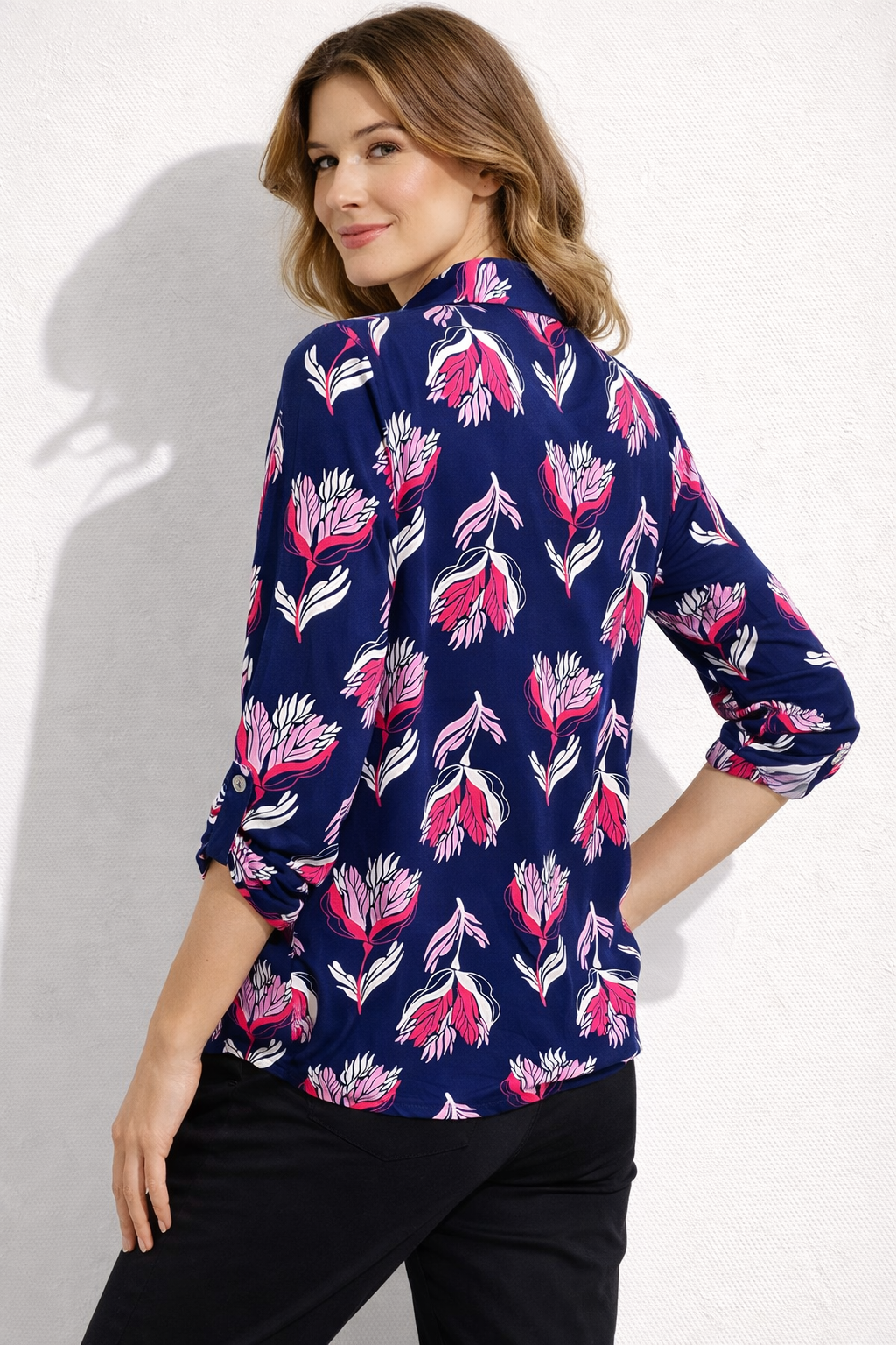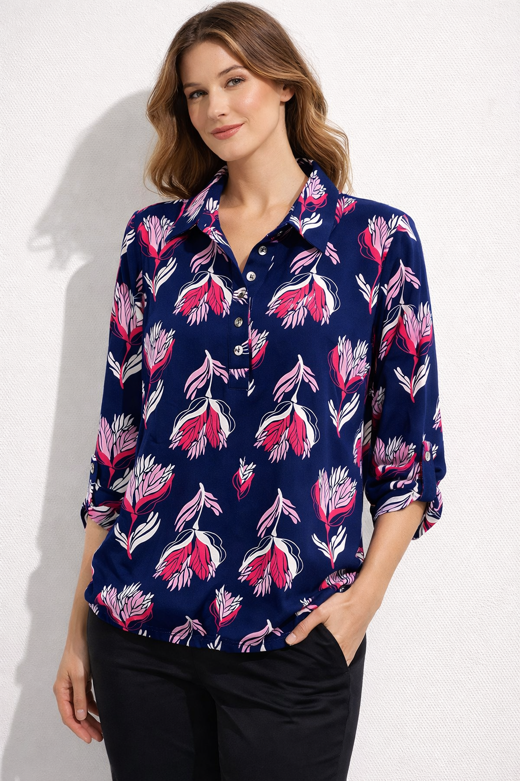 This top is a polished, relaxed-fit blouse in a deep navy base with a bold pink-and-white floral print. Key features: