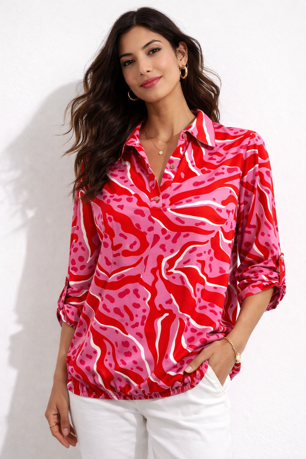 The top is a lightweight, relaxed-fit blouse in a vibrant pink and red abstract animal-print pattern. Key details: