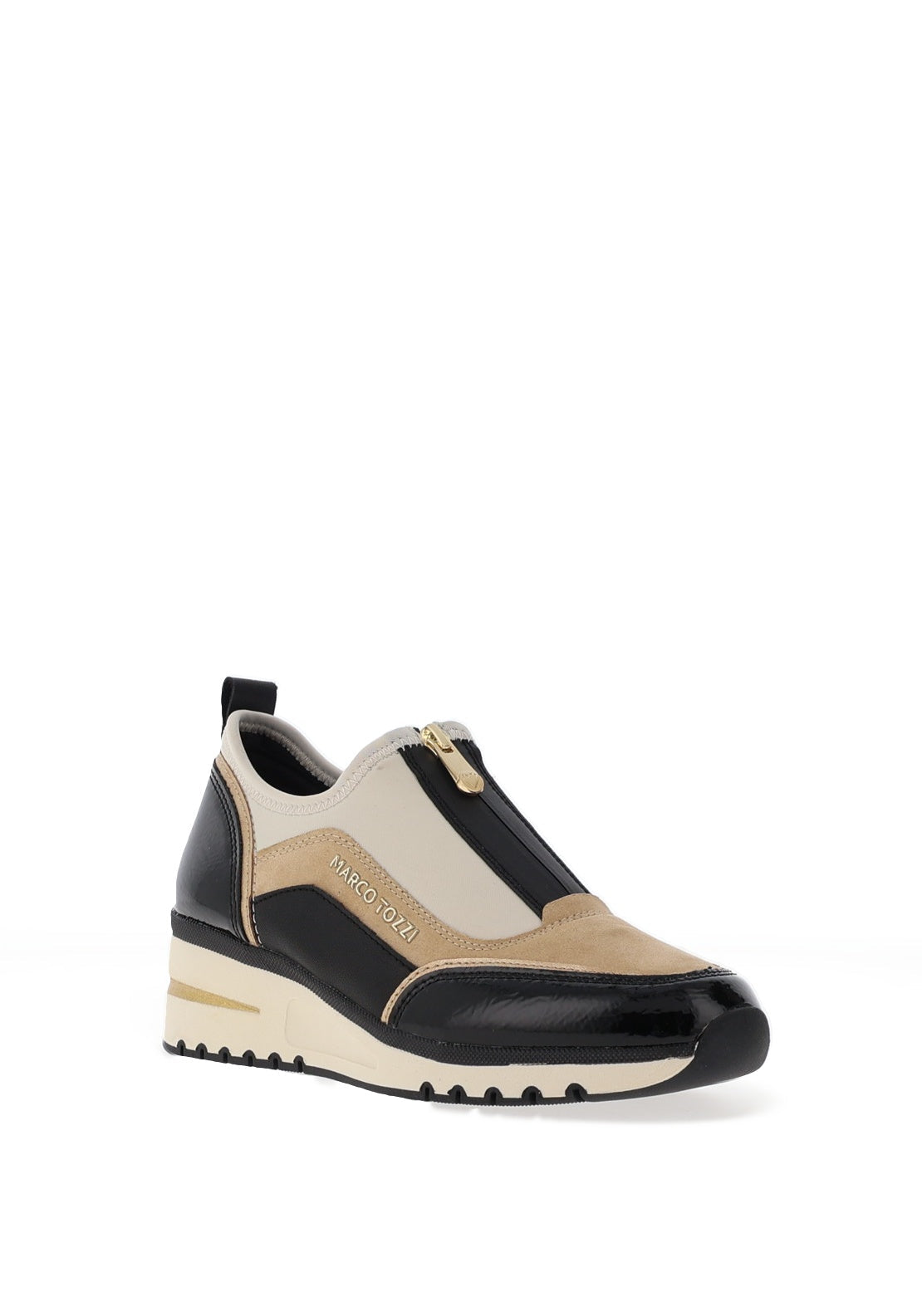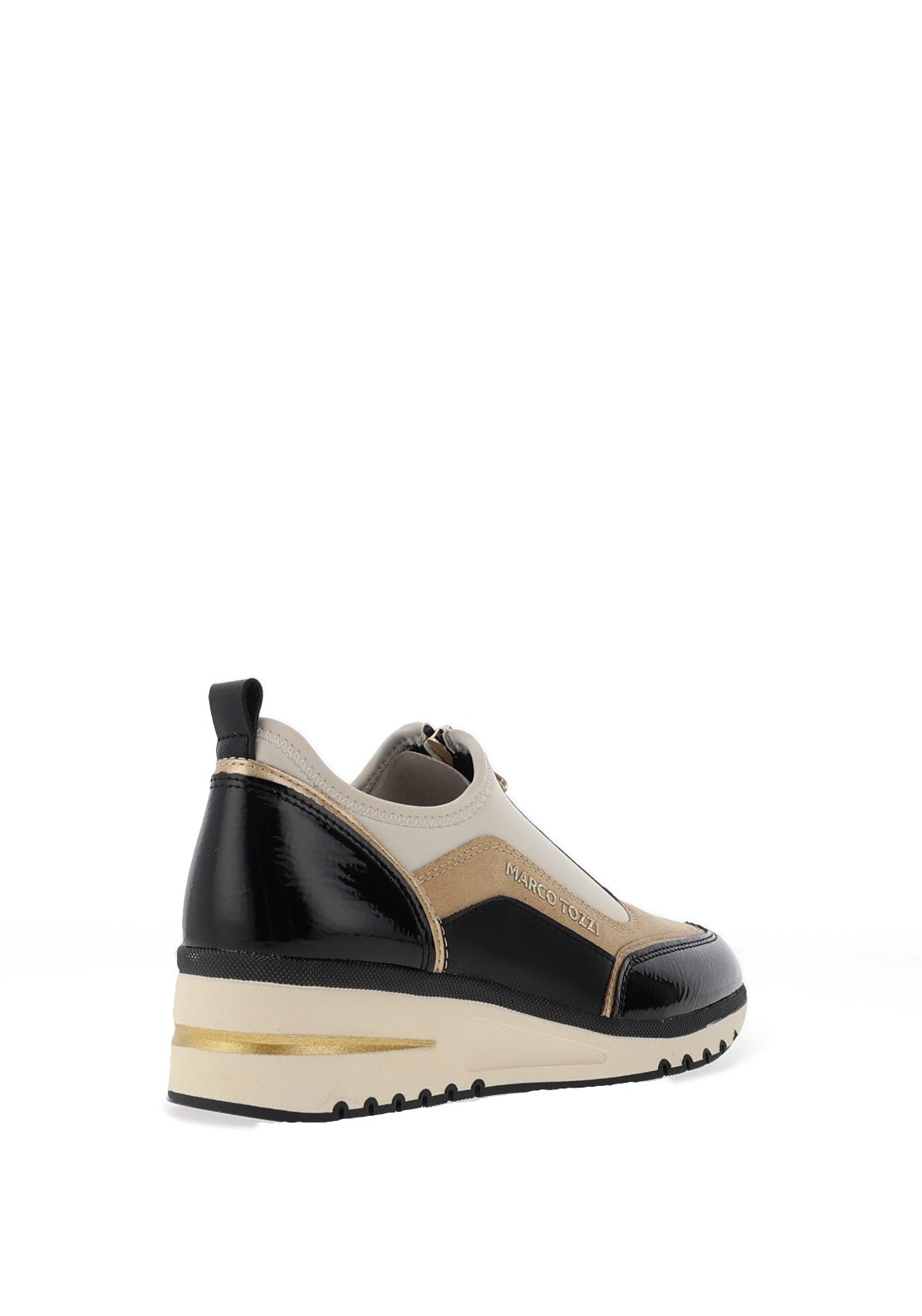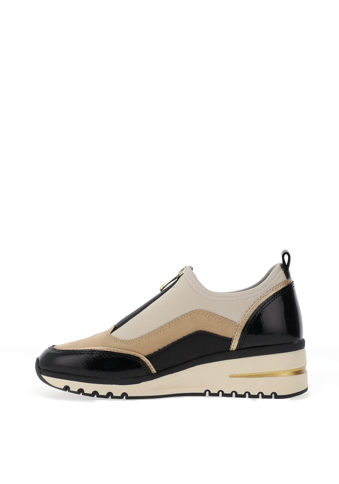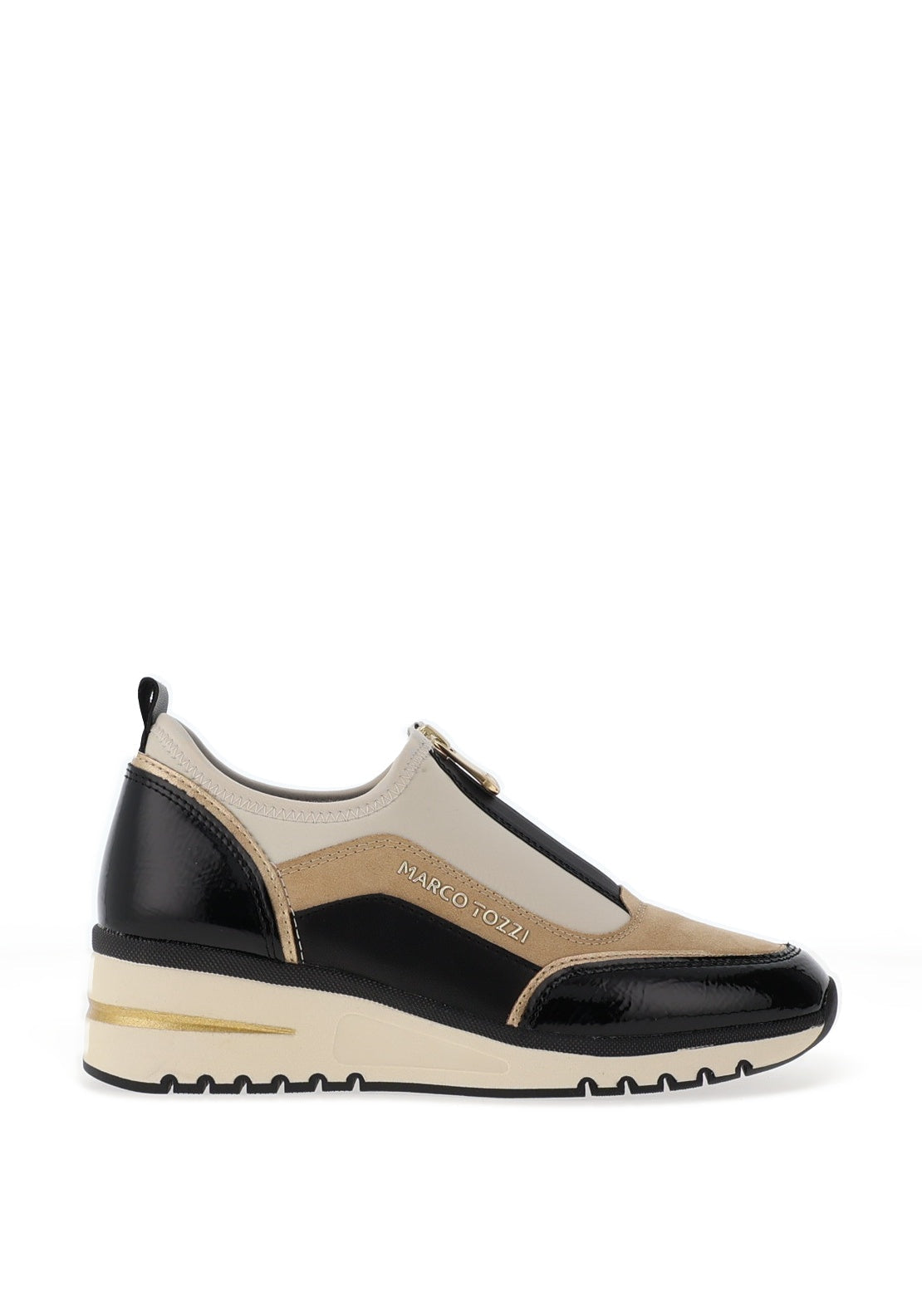 Experience the perfect blend of style and comfort with these trainers featuring a soft nylon upper complemented by faux patent details on the toe and heel. A gold-toned logo adorns the outer side, while a hidden front zip ensures easy wear. Enjoy added comfort with a cushioned, removable insole and a supportive wedge sole that elevates your look effortlessly.