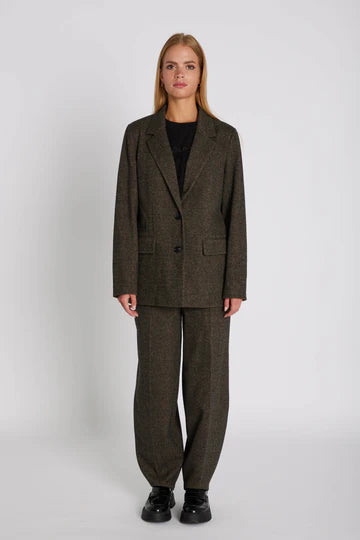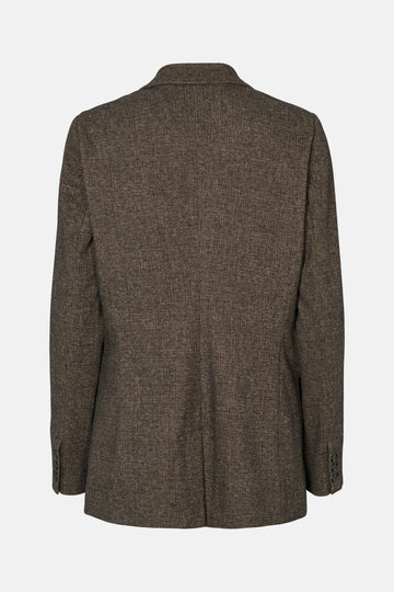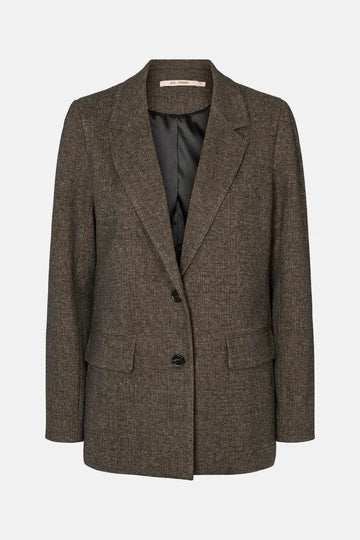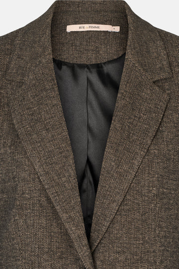 a sophisticated blazer with a classic cut and elegant lapels that accentuates a feminine, form-fitting silhouette.