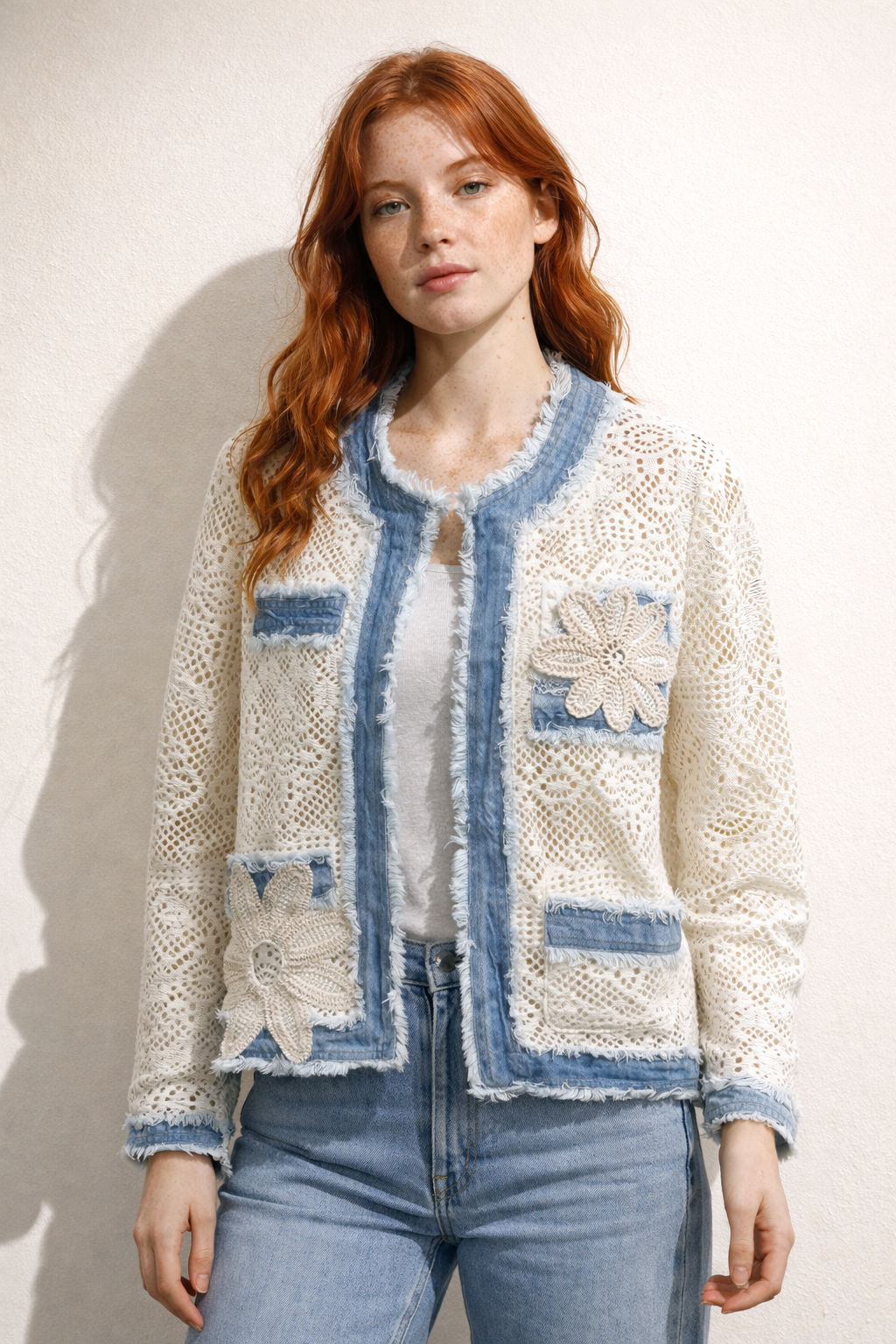A standout lace jacket crafted in a soft cream crochet fabric with an intricate floral pattern throughout. Designed with light blue denim trims along the neckline, front edges, hem, and cuffs, finished with a subtle frayed detail for a relaxed, contemporary look.