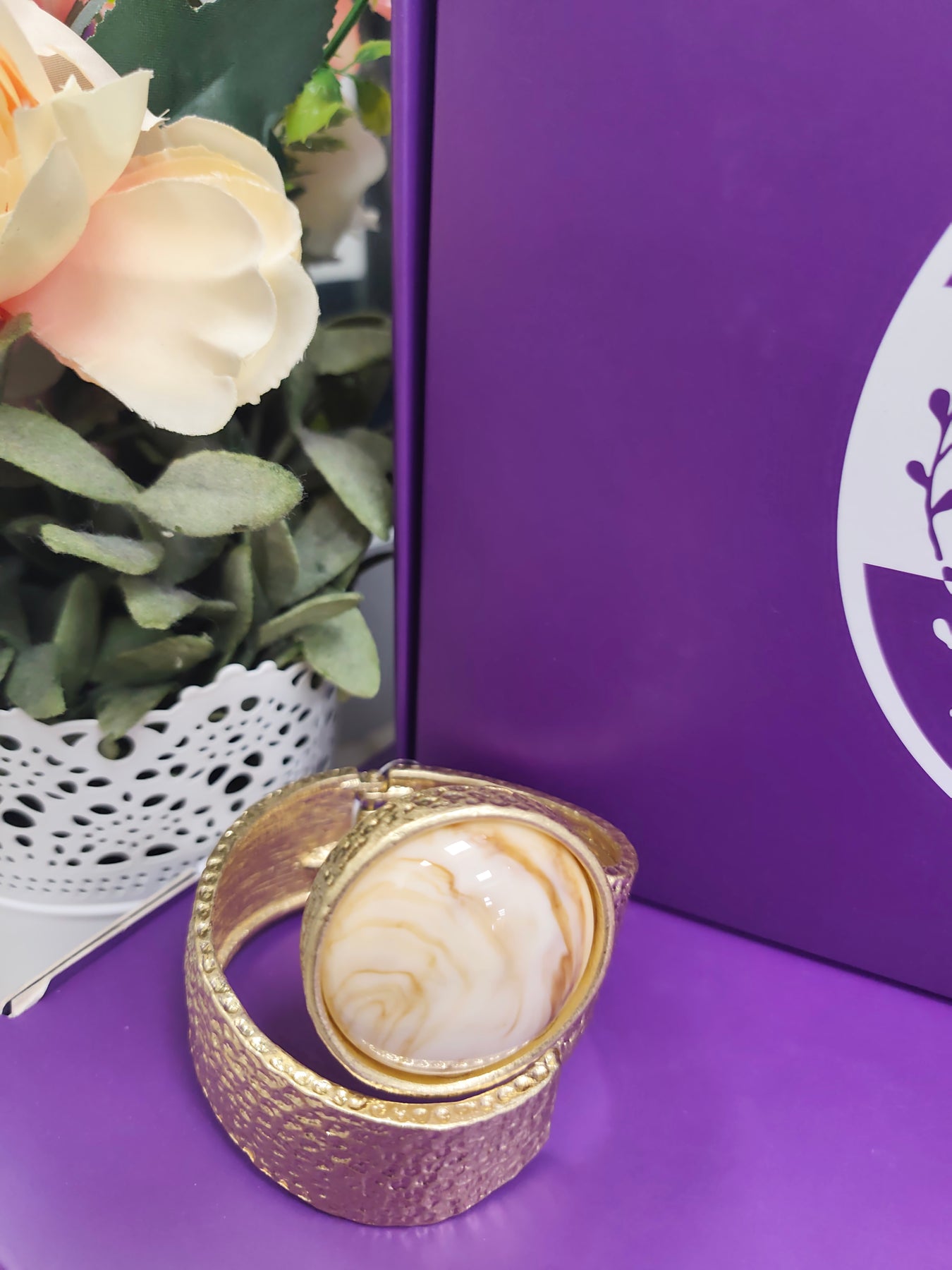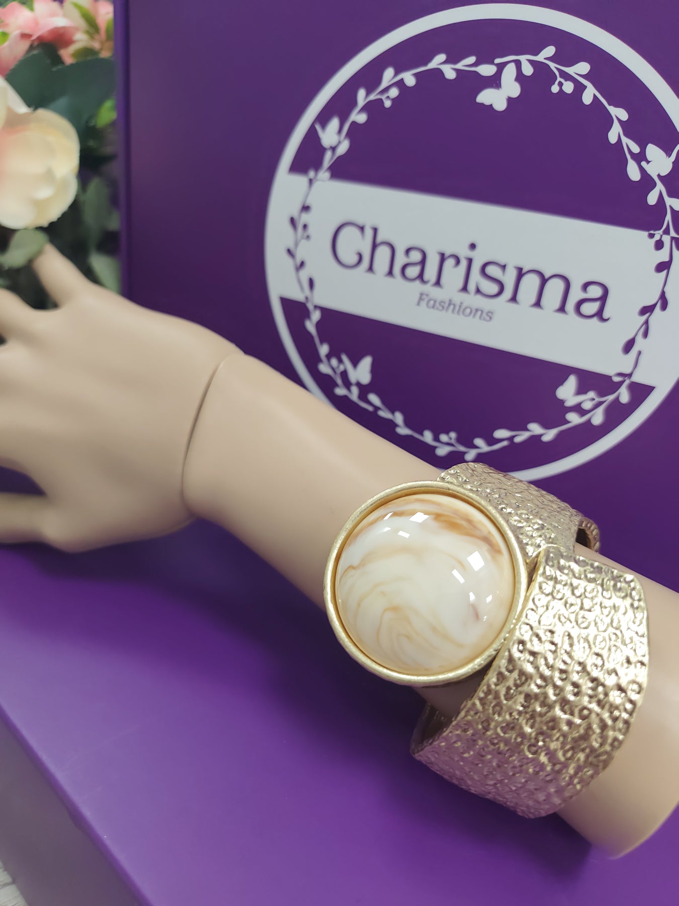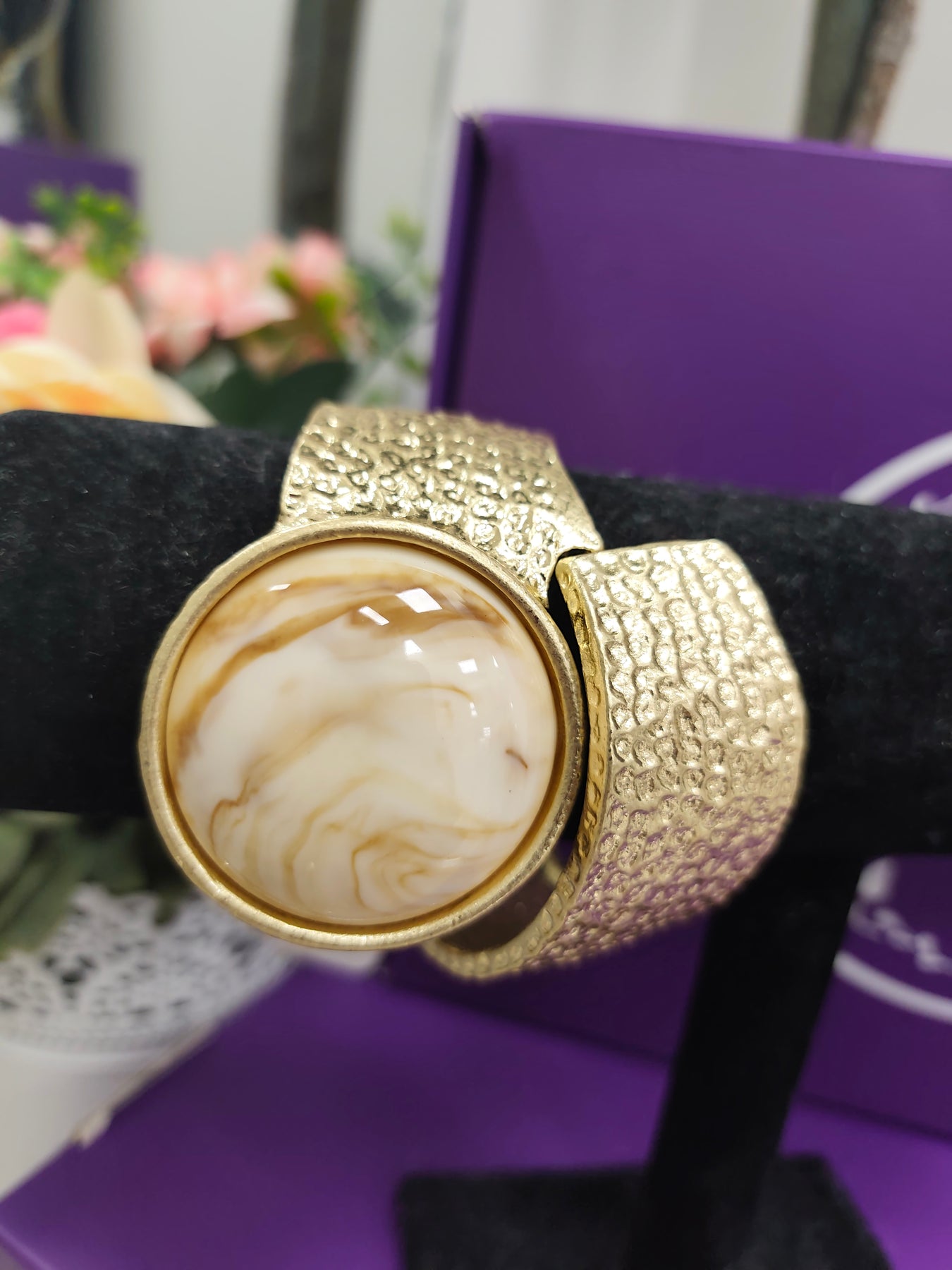 A striking statement cuff featuring a wide textured band and a bold circular centrepiece with a smooth, marble-effect cabochon. The organic surface pattern of the band contrasts beautifully with the glossy stone, creating a refined yet contemporary look. Designed to stand out, this cuff adds instant sophistication to both casual and occasion styling.