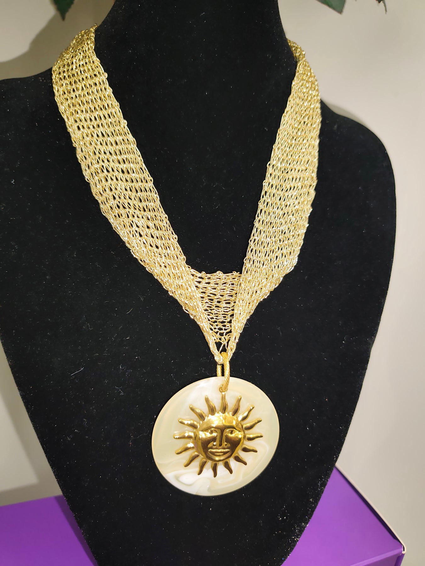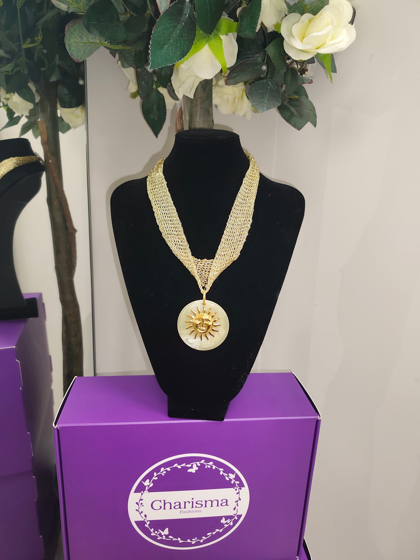 A bold, sculptural statement necklace designed to elevate any outfit. This striking collar features a wide, textured band gathered into elegant coils that frame a smooth central orb, creating a modern yet timeless focal point. The structured silhouette sits beautifully at the neckline, offering effortless sophistication from day to evening wear. Available in both gold-tone and silver-tone finishes, it pairs perfectly with everything from tailored pieces to flowing dresses.