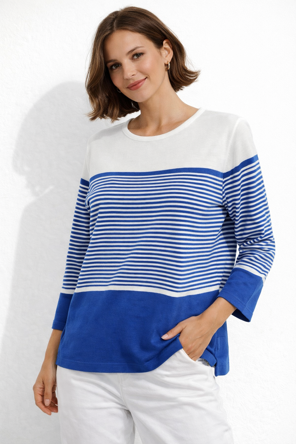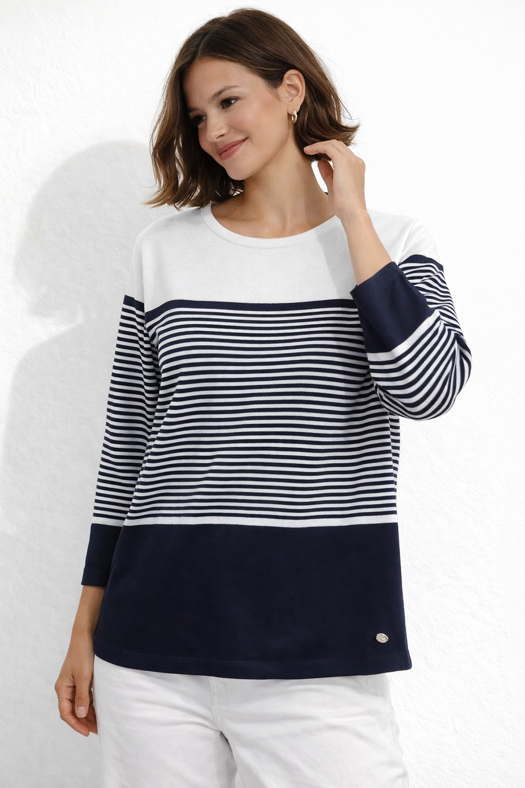 Solid white upper panel around the neckline and shoulders for a fresh, crisp look.
