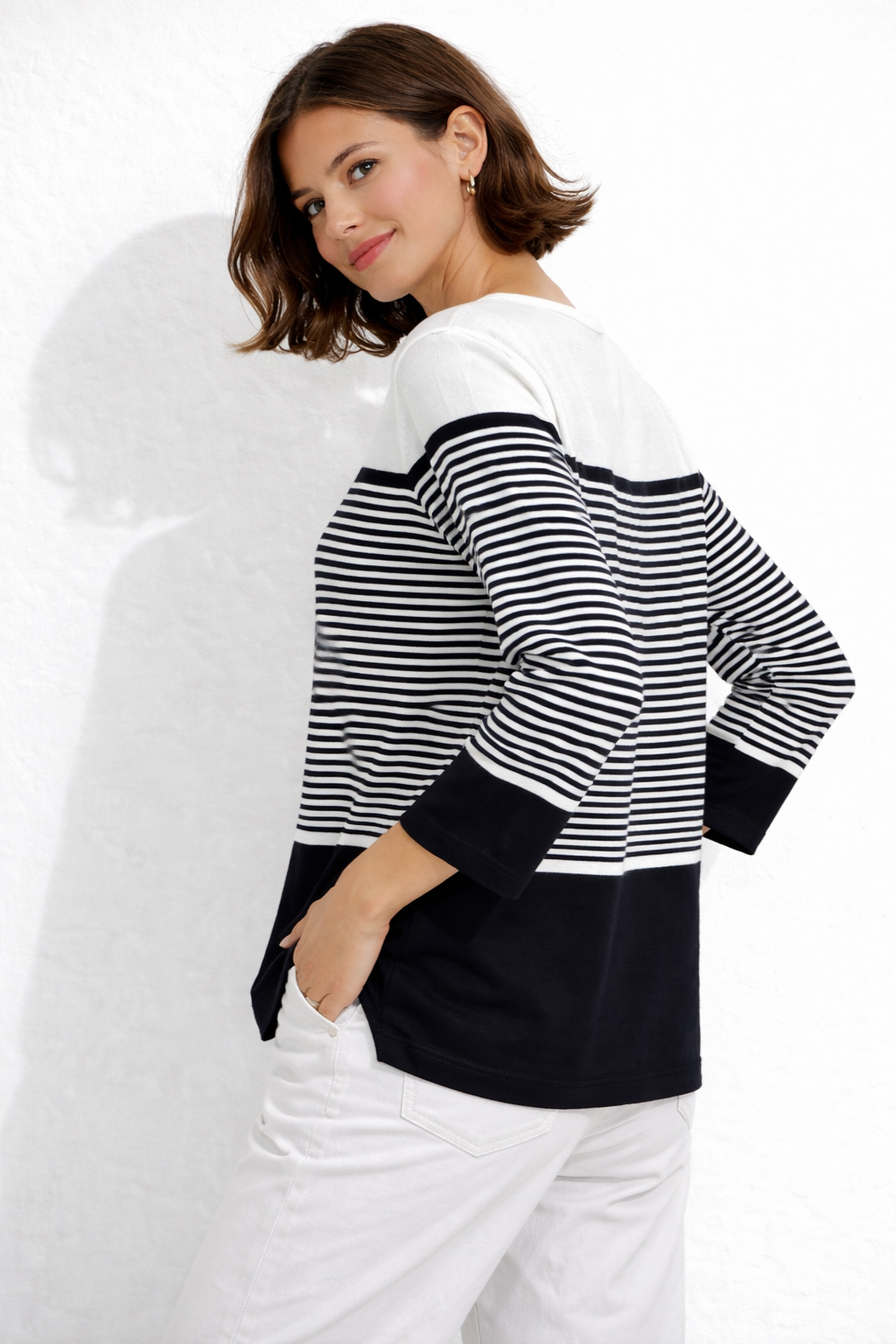 Colour & pattern: Classic black and white colour palette with horizontal stripes across the body, balanced by solid colour blocks.