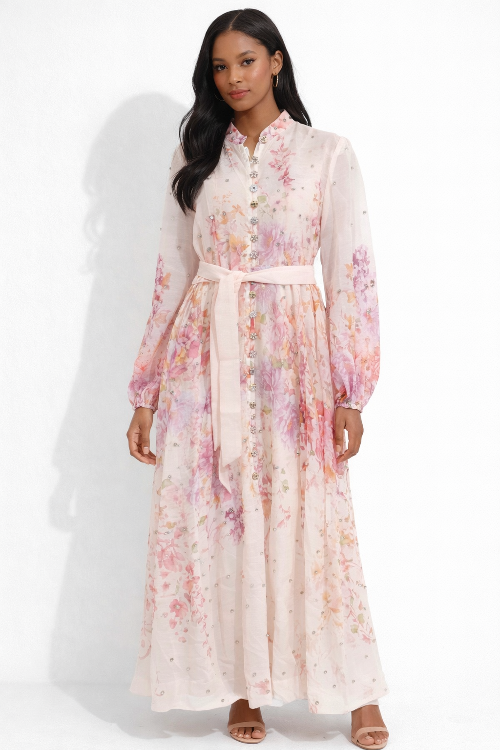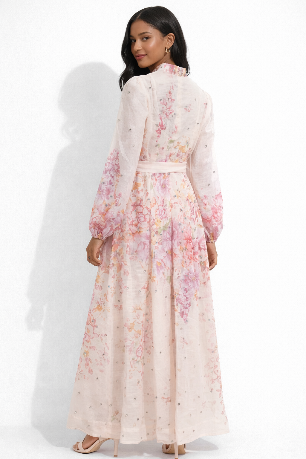 The dress is a romantic, long-sleeve maxi dress with an elegant, feminine design and intricate detailing.