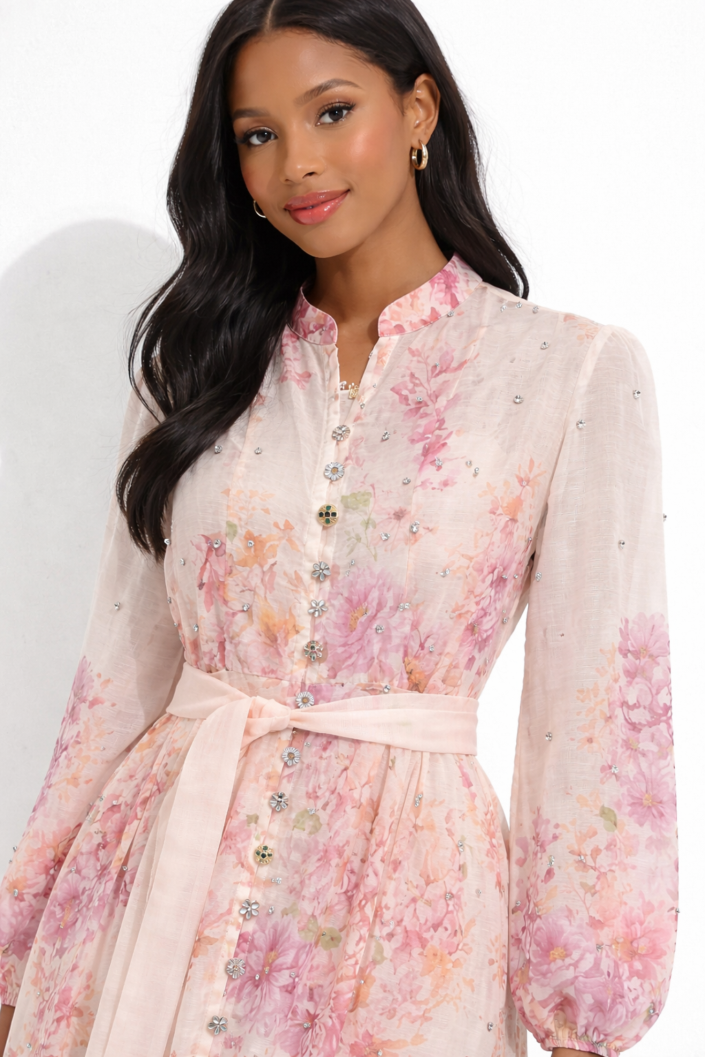 Waist: Defined with a self-fabric sash belt, tied at the waist to create a flattering, feminine shape.