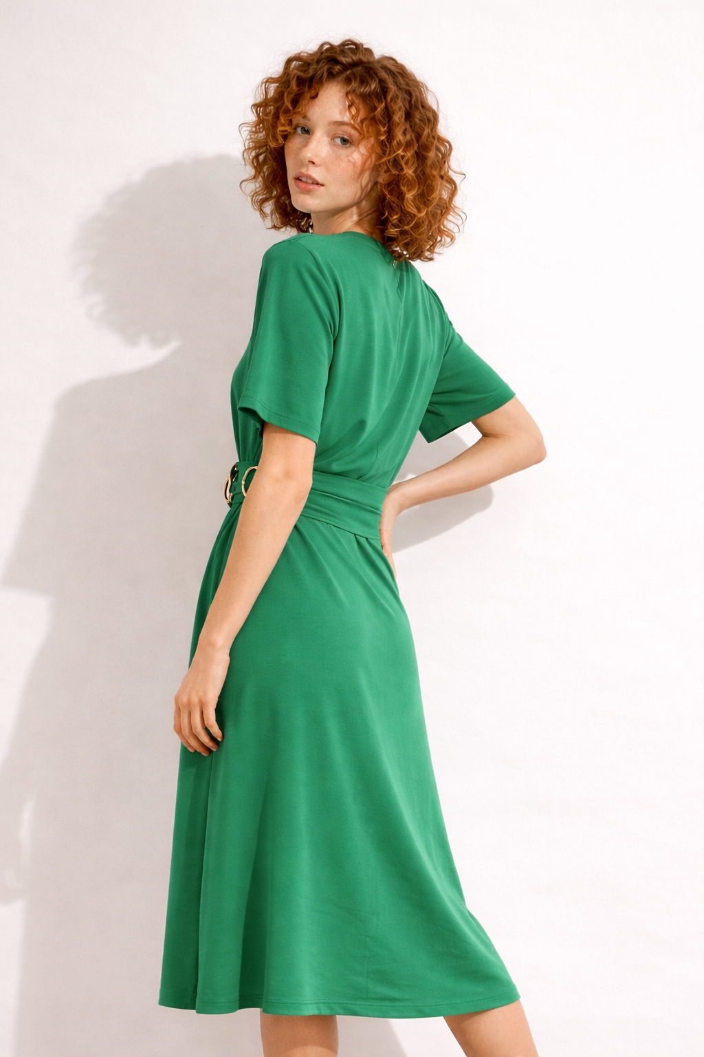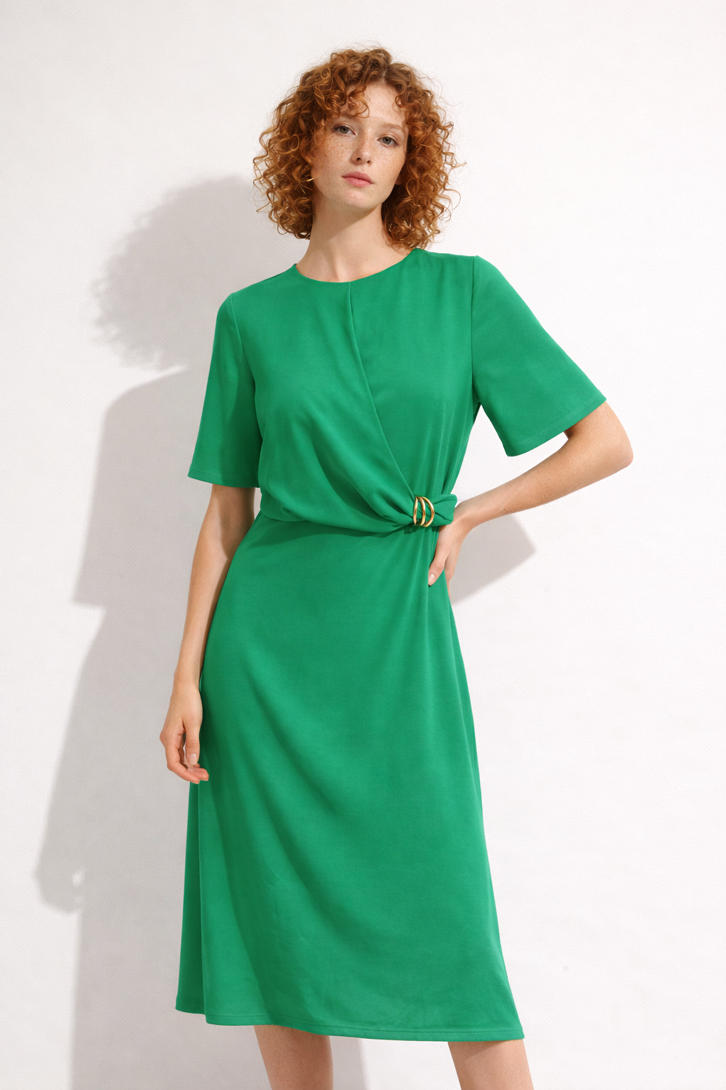 This is a vibrant green midi dress with a clean, elegant, and slightly modern silhouette. Here’s a clear breakdown of its design: