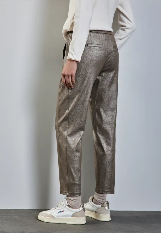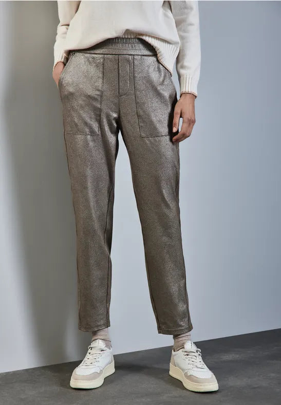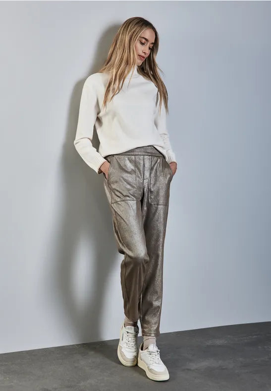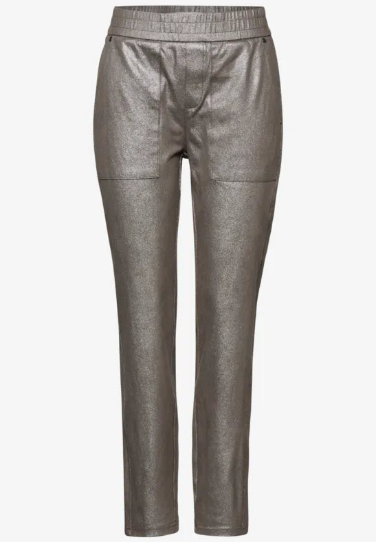 These trousers from Street One for women impress with a cool loose fit and patch pockets. The material mix with stretch and the mid waist ensure a comfortable fit. The coating gives this comfortable companion a slightly shiny faux leather look.