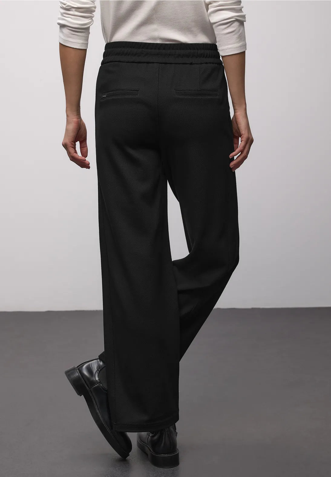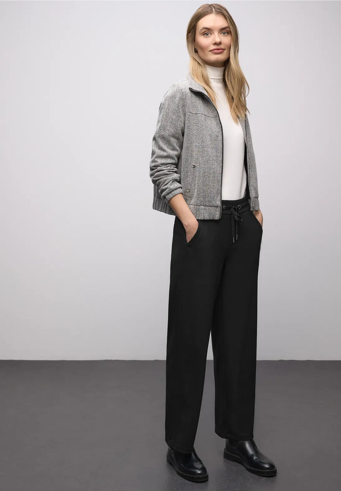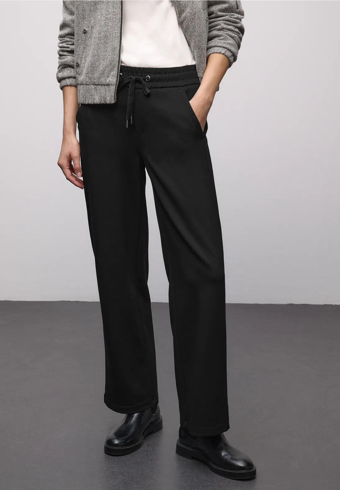 These women's trousers from Street One feature a casual fit with a mid-waist and straight leg. Tape details at the sides add a stylish touch. The elasticated waistband with drawstring and side pockets ensure comfort and functionality. Ideal for sporty everyday looks