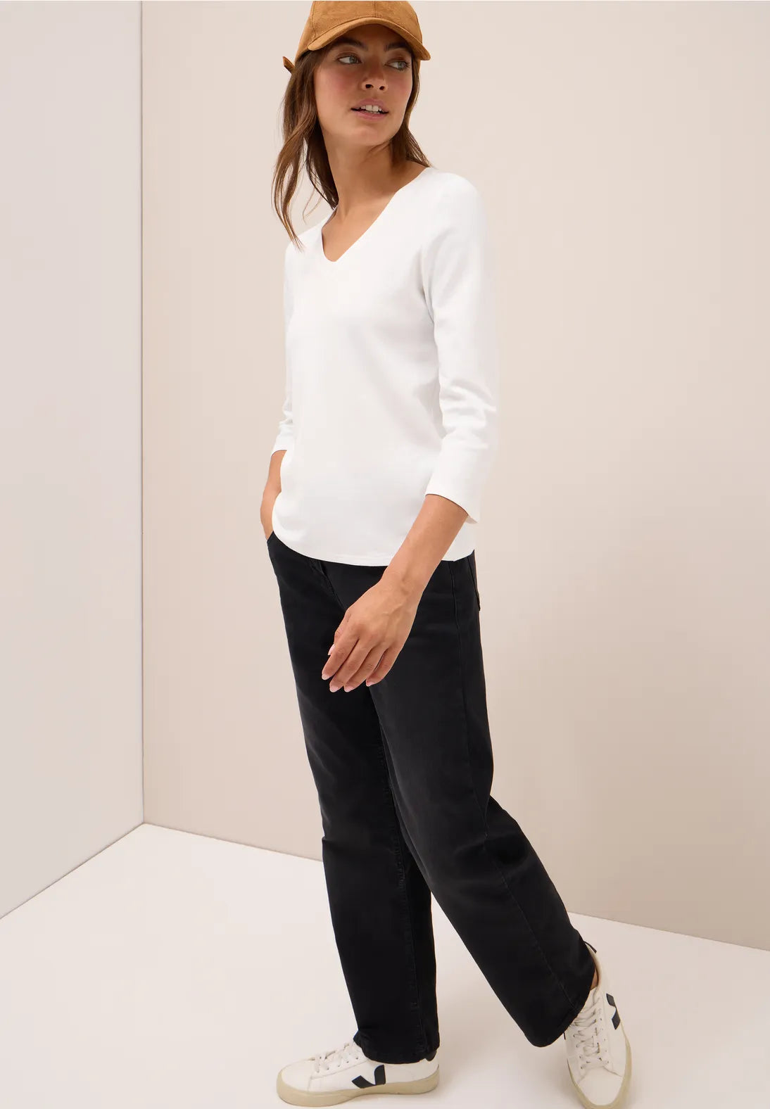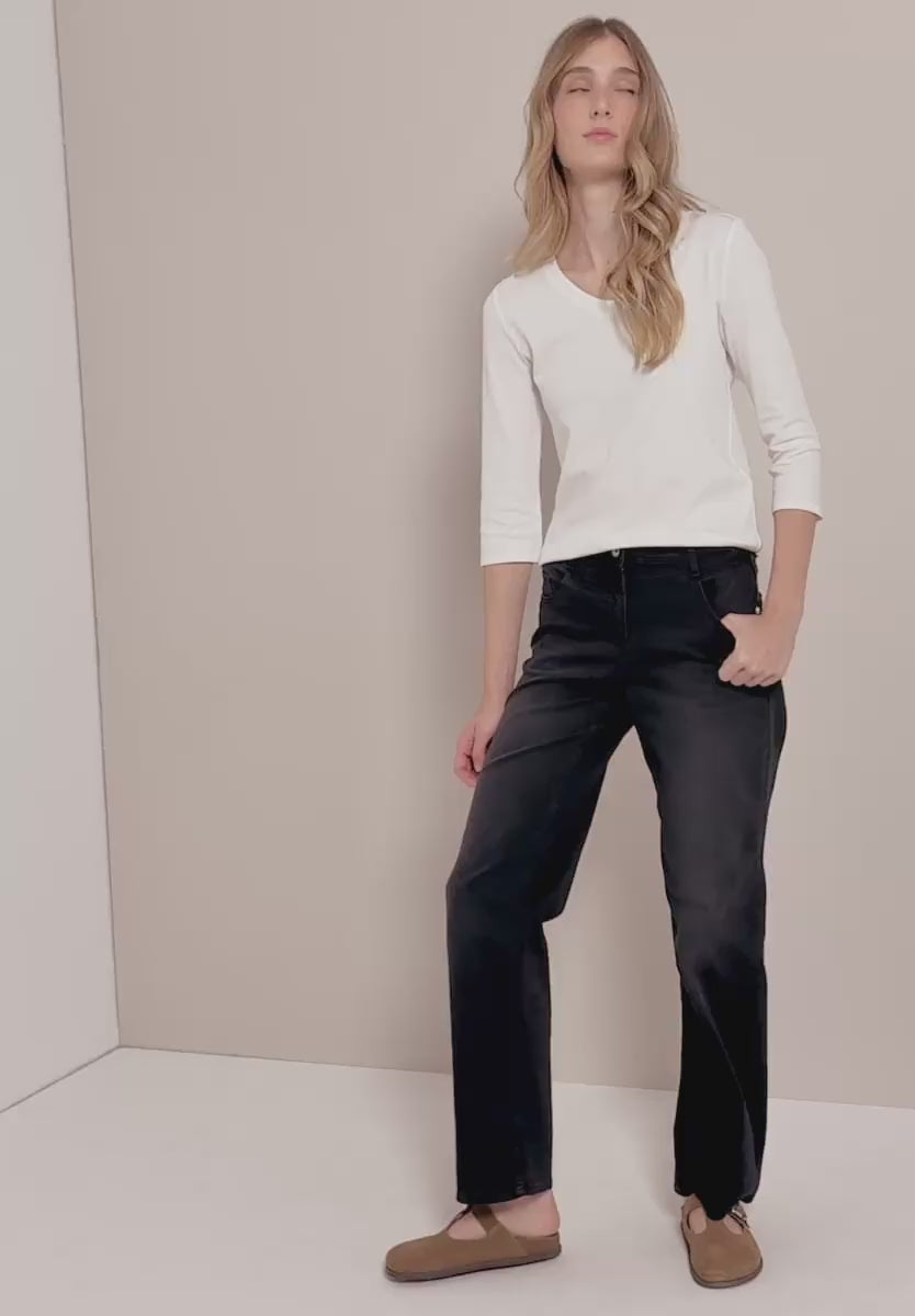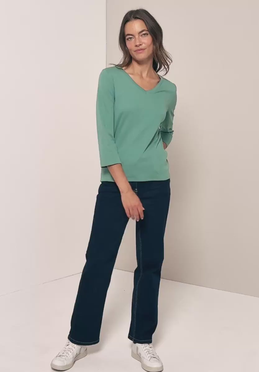 This basic women's shirt from CECIL is a simple piece with a feminine V-neck. The 3/4-length sleeves make it ideal for transitional seasons. Pure cotton ensures natural comfort with any outfit.