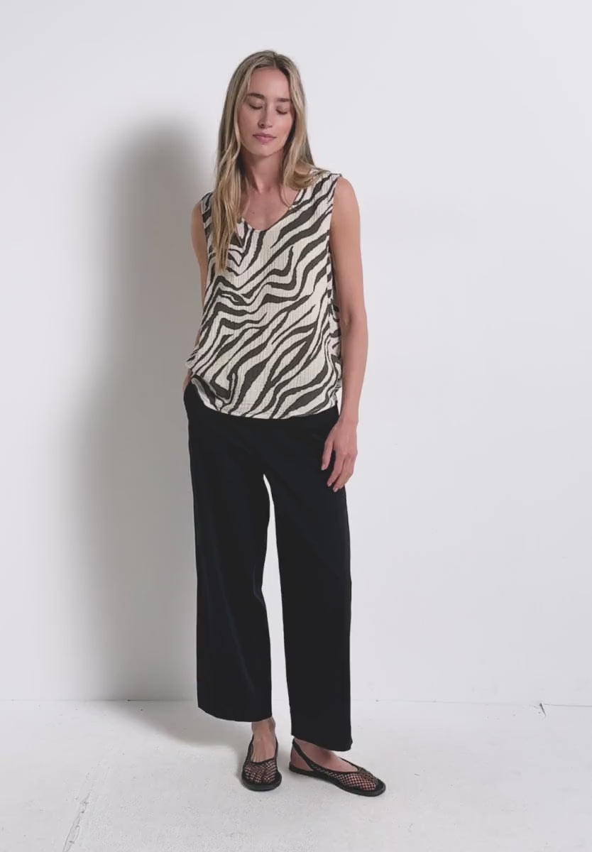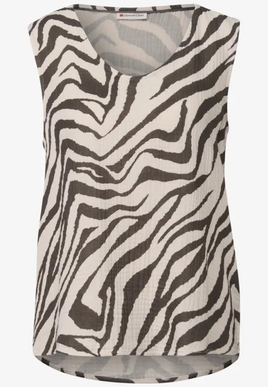 This sleeveless blouse top from Street One for women adds a fresh touch with its graphic pattern. The V-neck and rounded hem create a feminine look, while the pure cotton fabric ensures a breathable feel. Ideal for casual summer outfits.