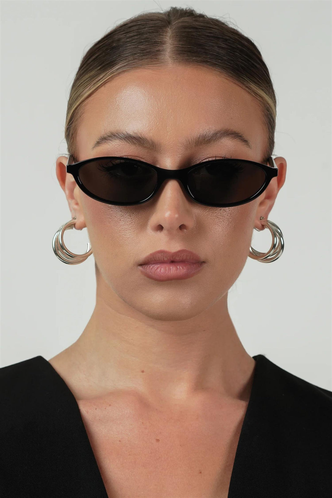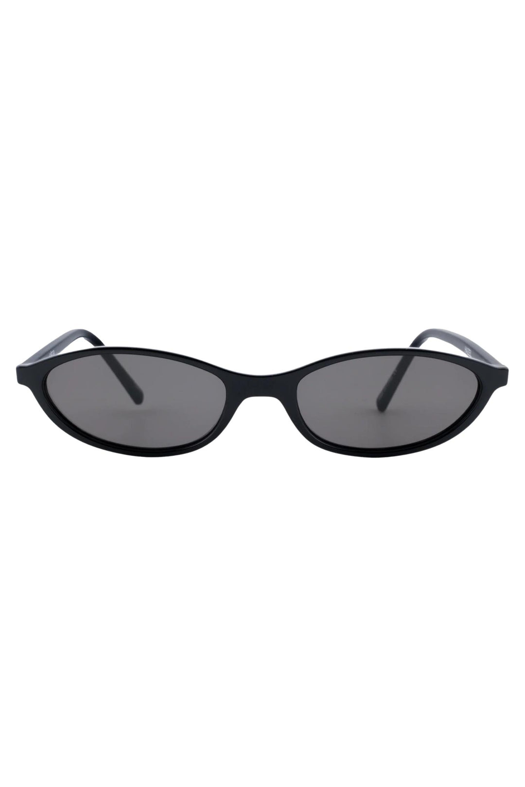 Hazel is a rounded, thin cat-eye silhouette in polished black, offering a sleek balance of classic elegance and modern edge. Paired with smoke lenses.