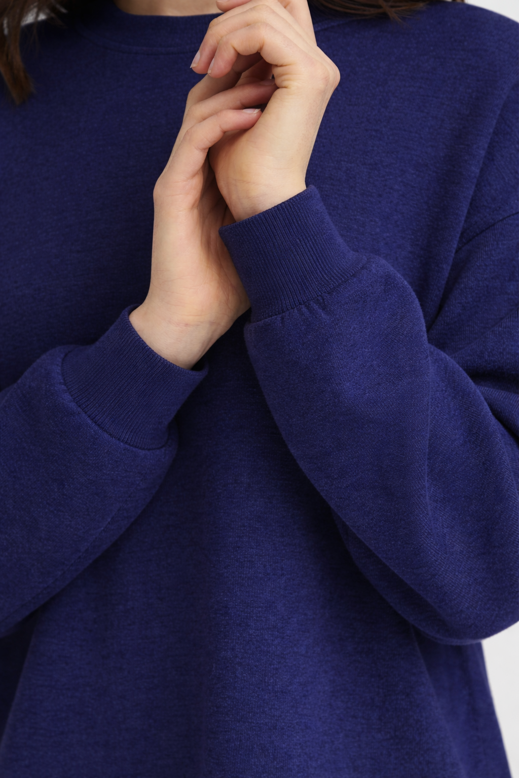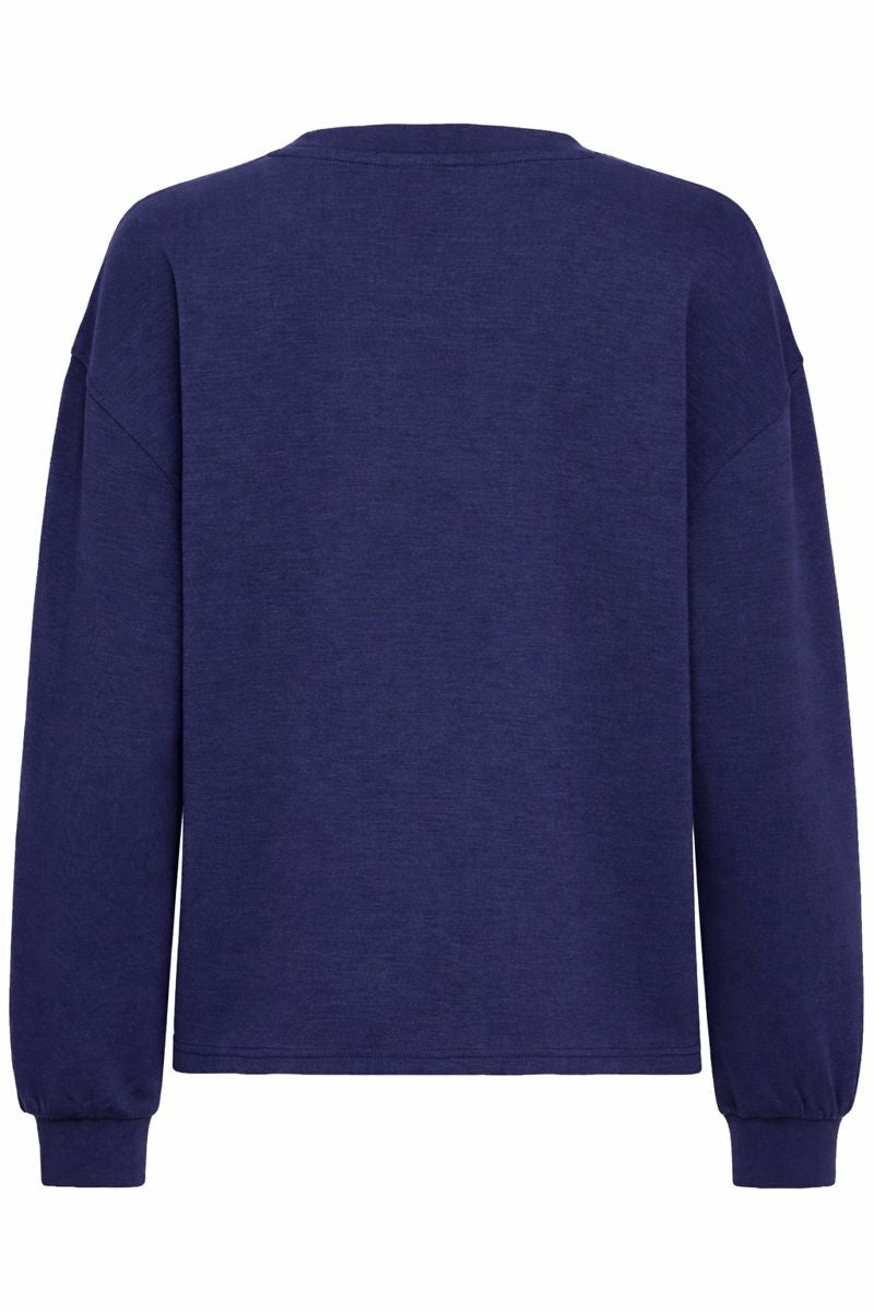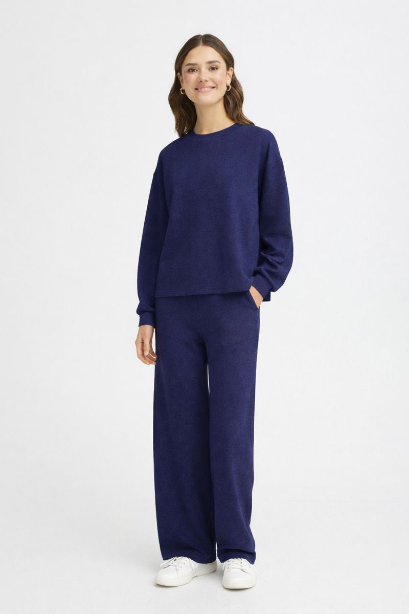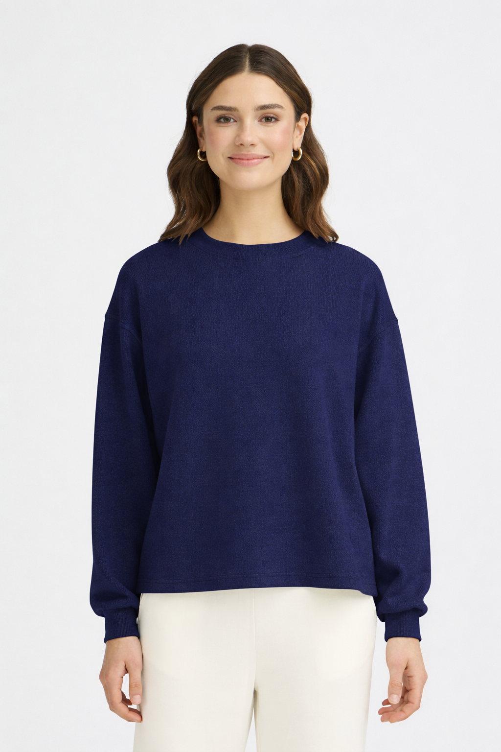 This jumper features a relaxed, easy-to-wear fit with a classic round neckline and long sleeves. Made from a soft, smooth fabric with a subtle stretch, it drapes beautifully without clinging. The deep navy blue shade gives it a timeless, versatile look that’s easy to dress up or down. Finished with ribbed cuffs and a straight hem for a polished yet comfortable feel, it’s perfect for everyday wear and effortless layering.